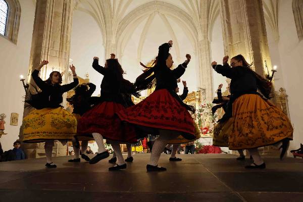 Tras las fotografías oficiales, la comitiva se dirigió a la iglesia de Santa María para la misa solemne, acompañada por el coro parroquial. La imagen de la santa quedó completamente cubierta por la ofrenda floral de las Águedas. Debido a la lluvia, la subasta de las andas y los bailes regionales tuvieron que celebrarse en el interior del templo, donde, en apenas unos minutos, voluntarios y participantes adaptaron el espacio para que la tradición pudiera continuar. Los bailes, interpretados por grupos de distintas edades, volvieron a mostrar la fortaleza de una escuela popular que se renueva generación tras generación, con jotas, paloteos y letras tradicionales adaptadas a la festividad.