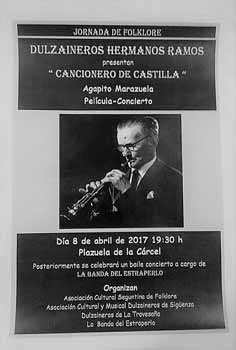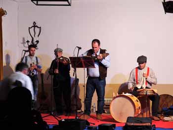 Volví al término del concierto de piano y cuarteto de viento, por suerte estaban en el intermedio tras la actuación de los Ramos. La Banda del Estraperlo ya estaba preparada para su “Baile-Concierto” y el público que salió a la plaza a disfrutar de la primaveral noche se reincorporaba a sus asientos. Esta particular banda está formada por Nacho Amo (cuerdas y voz), Juanjo Molina (percusión), Jorge Atance (viento) y Mariano el de Bujarrabal (violín y acordeón). La intención del grupo es recopilar y recrear música habitual en pueblos de esta zona en épocas en las que no había casi ni radio, pero donde llegaba la música de afuera y se transformaba rápidamente para apañar con los instrumentos de que se disponía. Era muy frecuente (según contaba Nacho) que en todos los pueblos alguien tocara el violín y apañase una jota o un fox-trot con igual maestría, con tal que la gente pudiera cantar y bailar. Mariano es todo un personaje (ya bien mayor) que disfruta haciendo aquella música y tiene una gran memoria musical, él es la base para mucho repertorio del grupo. También recuperan o fabrican instrumentos desaparecidos o en absoluto desuso, como en el caso de la “gaita serrana” que con habilidad tocó Jorge en un par de piezas (muy bueno con la flauta, por cierto). Juanjo hizo despliegue de todas sus artes tocando incluso con unas “quijadas” con palillos, para seguir con cucharas, pandero, pandereta, y muchos más. Nacho, aparte de narrador-introductor, tocó el guitarrico aragonés, el laúd o la guitarra con cuerdas de tripa (a la antigua) cantando en algunas piezas o solicitando la colaboración a su Mari, que sin dudarlo toca, baila o canta lo que le echen. Parece mentira la fuerza que da la música a quien le gusta, bastaba ver a Mariano con el violín o, ayudado, cargarse el acordeón y tocar tanto tiempo, y todo el rato de pie, nadie diría que pasa de los ochenta. En fin que la jornada llegó a su fin, solo nos faltó salir a la calle a tomarnos un trago de vino y seguir cantando y tocando todos juntos hasta las tantas; las salas de audición siempre resultan más frías para esto y parece que se tratara de un museo recreativo de la música popular antigua. En cualquier caso enhorabuena por la iniciativa. ¡Aúpa a los Ramos y a los estraperlistas!