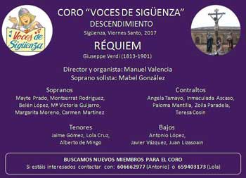 El 15 de abril durante el acto del "Descendimiento", organizado por la Cofradía de la Vera Cruz y el Santo Sepùlcro de Sigüenza el coro "Voces de Sigüenza" acompañó a la soprano solista Mabel González, dirigidos todos por el organista Manuel Valencia. El coro interpretó de manera brillante el Réquiem de Giussepe Verdi, que acompañó a la ceremonia del "Descendimiento" que precedió a la procesión del Silencio. La interpretación consiguió realzar el acto recién recuperado.