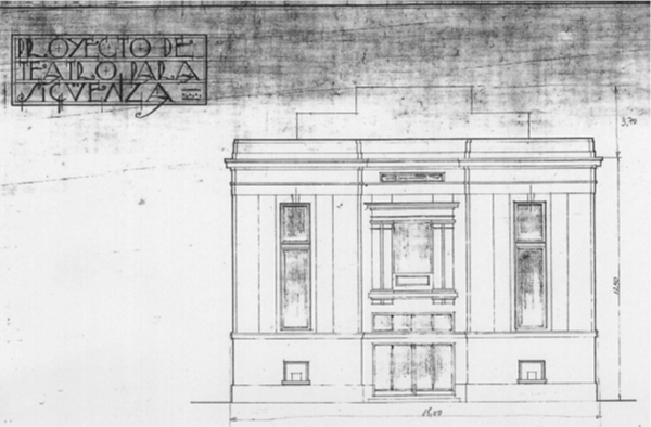 Para realizar este artículo vamos a seguir el artículo de Luis Lozano, periodista seguntino amigo del pintor Francisco Santa Cruz –quien realizó la decoración del “Ambigo” bar anexo- publicado en Flores y Abejas el 5 de octubre de 1930 titulado “El teatro nuevo de Sigüenza o el triunfo de la voluntad”. También utilizaremos el plano conservado en el Archivo Histórico Provincial de Guadalajara, donde se puede apreciar que el proyecto fue firmado por el joven arquitecto madrileño de 29 años Enrique López Izquierdo, arquitecto proyectista del Teatro Albéniz y reformador de otros prestigiosos teatros de Madrid.