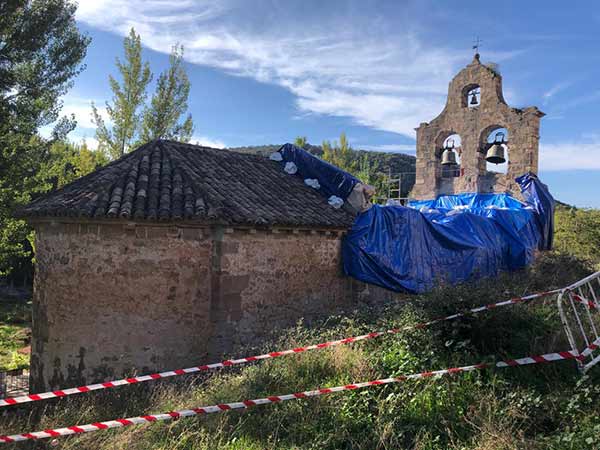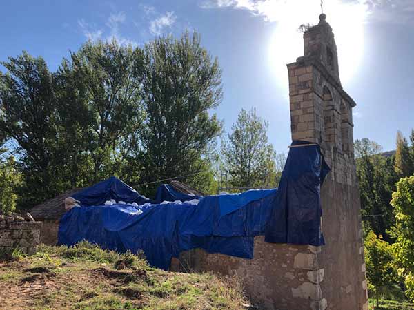 Enrique Pleite, responsable de Casas de la Alcarria, nos informa de las actuaciones encaminadas a la recuperación de la iglesia. “El derrumbamiento se debió a que la cubierta empujó el muro que está en dirección al pueblo y lo derribó. La cubierta se quedó sin apoyo por lo que se ha quitado todo el peso de sobra la bóveda para y se ha apuntalado por dentro el coro y otro forjado horizontal que había para que aguantara el peso del edificio”. En cuanto a los trabajos señala que “se han dejado las bóvedas al aire protegidas con una lona por si llueve y pueda afectar a las pinturas mientras se redacta el proyecto de reconstrucción del muro y construcción de una nueva cubierta. Para ello se han terminado de retirar los escombros que cayeron en el lateral y se han guardado las piedras y silllares para cuando se haya el proyecto de restauración tras los permisos de Cultura y el Ayuntamiento de Sigüenza”.