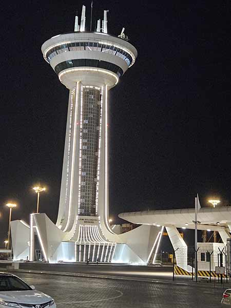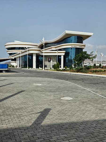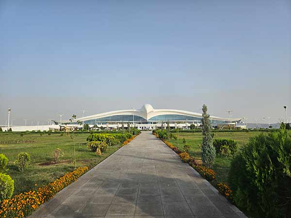 El primer impacto que tuvimos al llegar allí fue el aeropuerto, con muy pocos visitantes, súper limpio, enorme, lujoso, con forma de gavilán, todo en mármol blanco. Ahí presentas la carta invitación y te conceden el visado pagando 70 dólares. También tienes que pagar, obligatoriamente en dólares, una prueba de Covid, que consiste en pasar levemente un hisopo por la nariz, sin convicción, y a los dos minutos te dan el resultado ya impreso con todos tus datos, sin existir en el lugar ninguna impresora, en fin, un timo, que nuestro guía nos explicó que el gobierno había comprado varios millones de hisopos en el 2021, y como apenas se utilizaron allí, amortizan su coste con todos los visitantes.
