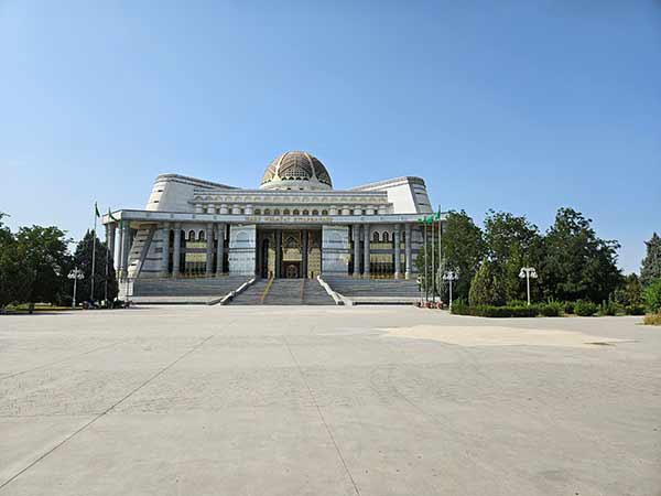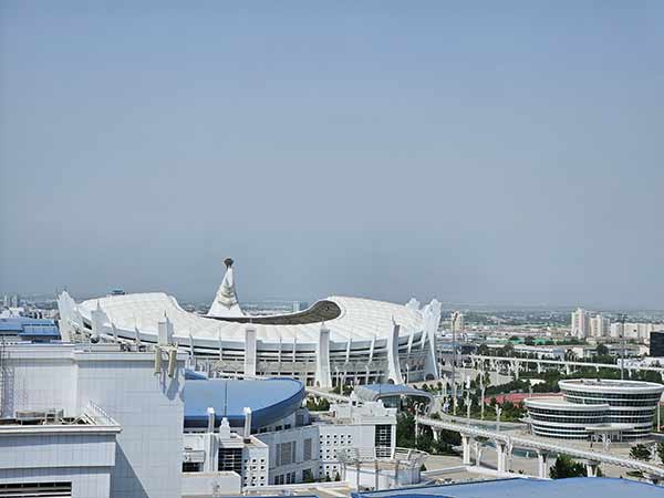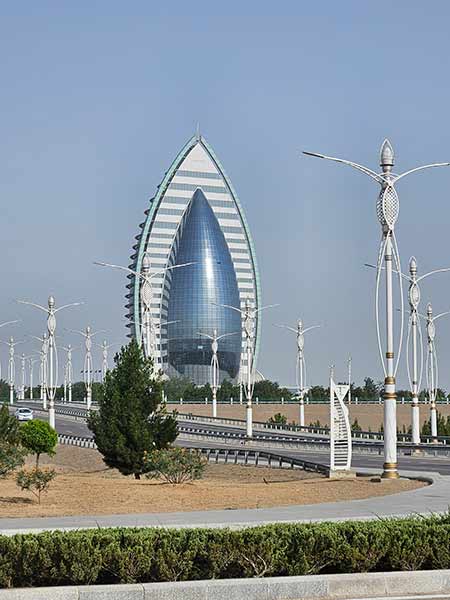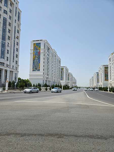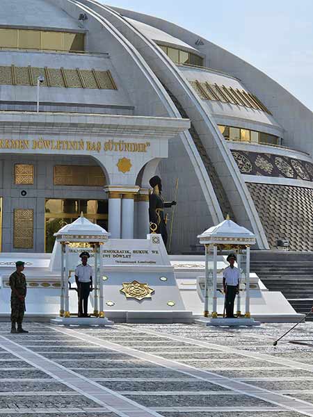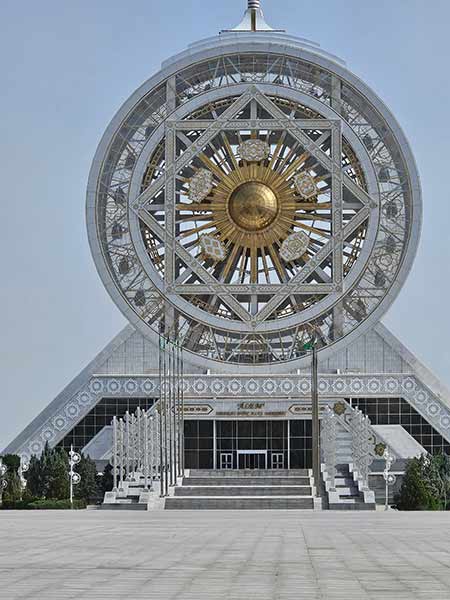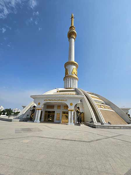 Las extravagancias de los sucesivos dictadores se han cebado en Asgabat, todos los edificios de la ciudad son de mármol blanco, sin posibilidad de otro color, las antiguas casas de la época soviética, están todas cubiertas de losas de mármol blanco, los numerosos monumentos existentes son blancos, pero aquí se rompe esa regla, ya que muchos tienen partes doradas, y otros directamente tienen oro.