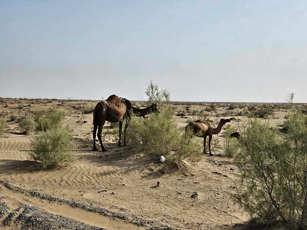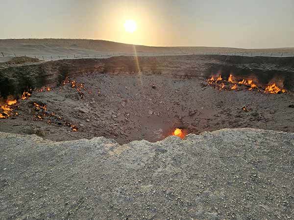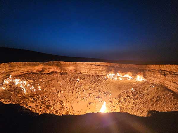 Salimos de la ciudad y por una muy buena autovía, nos dirigimos allá atravesando el desierto de Karakún, desierto pedregoso, sin apenas vegetación, y con camellos salvajes por algunas zonas. La carretera pasó de ser estupenda a muy mala, con baches, y zonas de tierra. Por el camino hicimos varias paradas para ver una sima, hundida con agua, y otra sima de gas, con una llama pequeña. Llegamos de día a la sima de Darwaza, una cueva hundida en mitad del desierto con varios focos de gas encendido, en ese momento la sima es espectacular, pero las llamas, con la luz del día, no emocionan, pero llegada la noche, dentro del paraje desértico, una sima iluminada por las llamas, de fuerte color naranja, que emerge en la completa oscuridad, entendiendo que los pocos habitantes de la zona lo llamen la Puerta del Infierno.