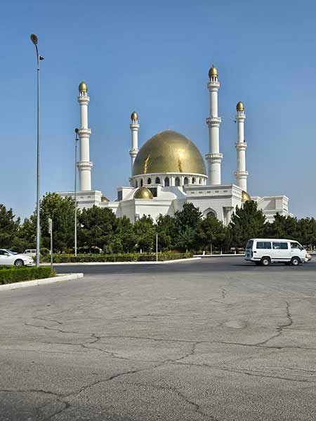 De vuelta a Asgabat a descansar, al día siguiente partimos a la ciudad de Mary, una ciudad situada cerca de la frontera con Irán, y con Afganistán. La ciudad tiene monumentos y edificios similares a los de Asgabat, de mármol blanco, calles muy limpias, todo cuidado y perfecto, donde sobresale una maravillosa mezquita blanca, con la cúpula dorada.