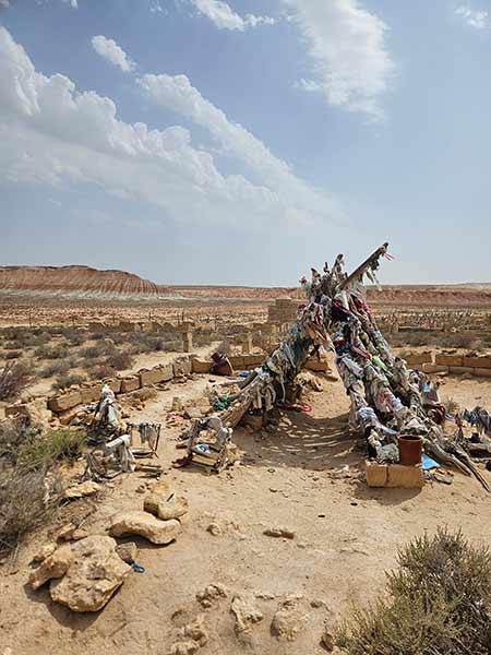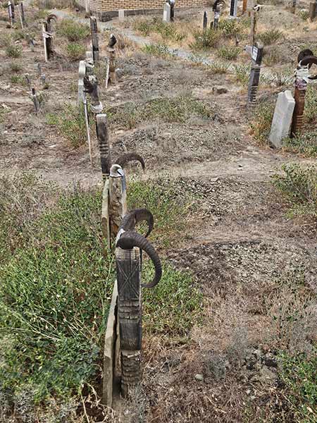 Ya de vuelta a Asgabat, hicimos una parada en una pequeña ciudad cerca de la frontera de Irán, poblada por el pueblo Nojur, con un idioma propio, y vestimentas distintas a los turkmenos. En el cementerio local pudimos ver que todas las tumbas tienen encima unas cornamentas de cabra, a modo de guía al mas allá.