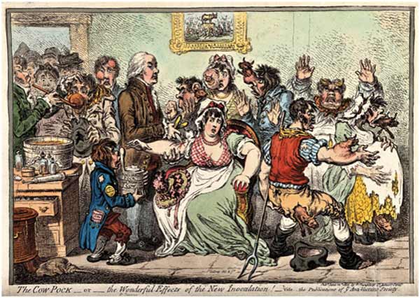 La viruela de la vaca o Los asombrosos efectos de la nueva inoculación de James Gillary, publicado por H. Humphrey, St. James’s Street, Londres, el 12 de junio de 1802. Como se ve, el miedo al progreso se daba entonces tanto como ahora.