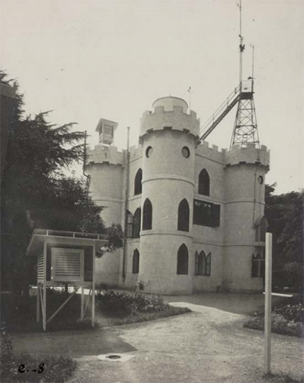 El Castillete, parque del Retiro, cerca del año 1900. Se advierten en la terraza varios elementos de observación meteorológica.