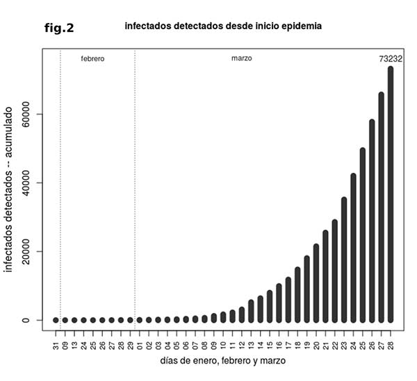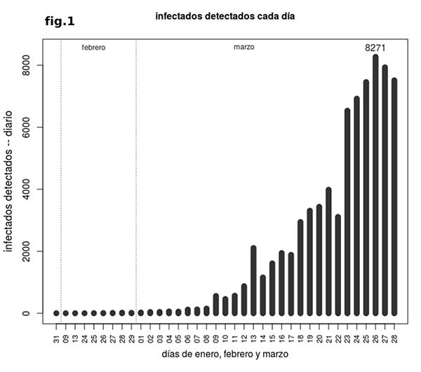Hay que tener en cuenta que el número de casos detectados ha de ser bastante inferior al número real total en cada momento ya que, en España, solo se está informando de casos detectados directamente por test virológico (en China, por ejemplo, a partir de un determinado momento se empezó a contabilizar casos por sintomatología clínica, sin test). Según algunos estudios la cifra real podría ser tan alta como 10 veces el número de detectados, la mayoría de ellos asintomáticos, aunque posiblemente con capacidad para transmitir la enfermedad. Esto tiene varias implicaciones, tanto desde el punto de vista de la gestión para evitar la propagación del virus, como a la hora de comprender los números de los que se dispone. Por ejemplo, la mortalidad tan alta del 8% sobre casos detectados será mucho más baja si se considera el total de infectados reales, bajando al 0.8% si esa relación 10 a 1 es correcta. Esto no importa a efectos de cálculo de datos en los mismos términos que los disponibles y para las proyecciones de, por ejemplo, el momento en el que se acabará la epidemia.