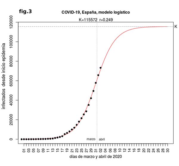 En cuanto a la duración de la epidemia, una vez que podemos estimar K es posible ajustar los datos observados a uno de los dos modelos por técnicas matemáticas de regresión y a partir de la ecuación obtenida extrapolar hacia el futuro. Cuando hacemos esto para el modelo logístico, viendo la curva de proyección resultante (fig. 3) observamos que el número de casos diarios se aproximará a cero alrededor de mediados de abril (la curva tiende a la asíntota K). En caso de ajustar a modelo de Gompertz el resultado es aproximadamente el mismo, con la diferencia de que el número de casos crece más deprisa ya que se debe llegar a una K más alta.