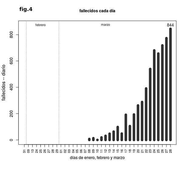 Es posible ajustar las curvas a los datos de fallecidos (fig. 4), que son más fiables, pero el problema es que desde que se detecta una infección y el momento en que, eventualmente, se produce el fallecimiento pasan varios días, por lo que el pico de fallecidos viene después del de infectados detectados. Con los datos actuales, se puede estimar una tasa diaria de unos 1000 fallecidos al día a una semana vista desde el pico de infectados aproximadamente, momento en el que la curva de fallecidos comenzaría en principio su propio camino descendente.